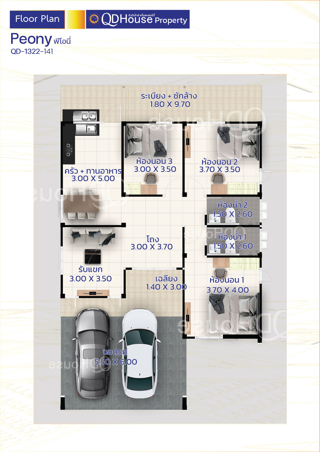 QDHouse Review เเบบบ้าน PEONY เเบบบ้านลงตัว ห้องครัวขนาดใหญ่ ห้องรับเเขกเเยกส่วน | QDHouse