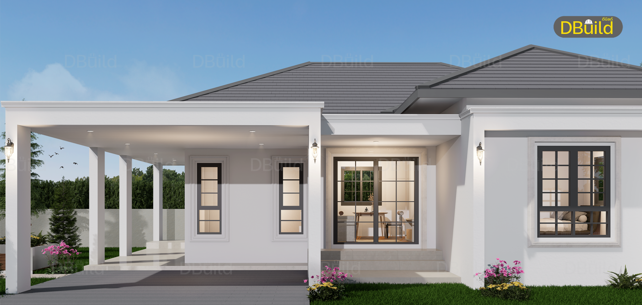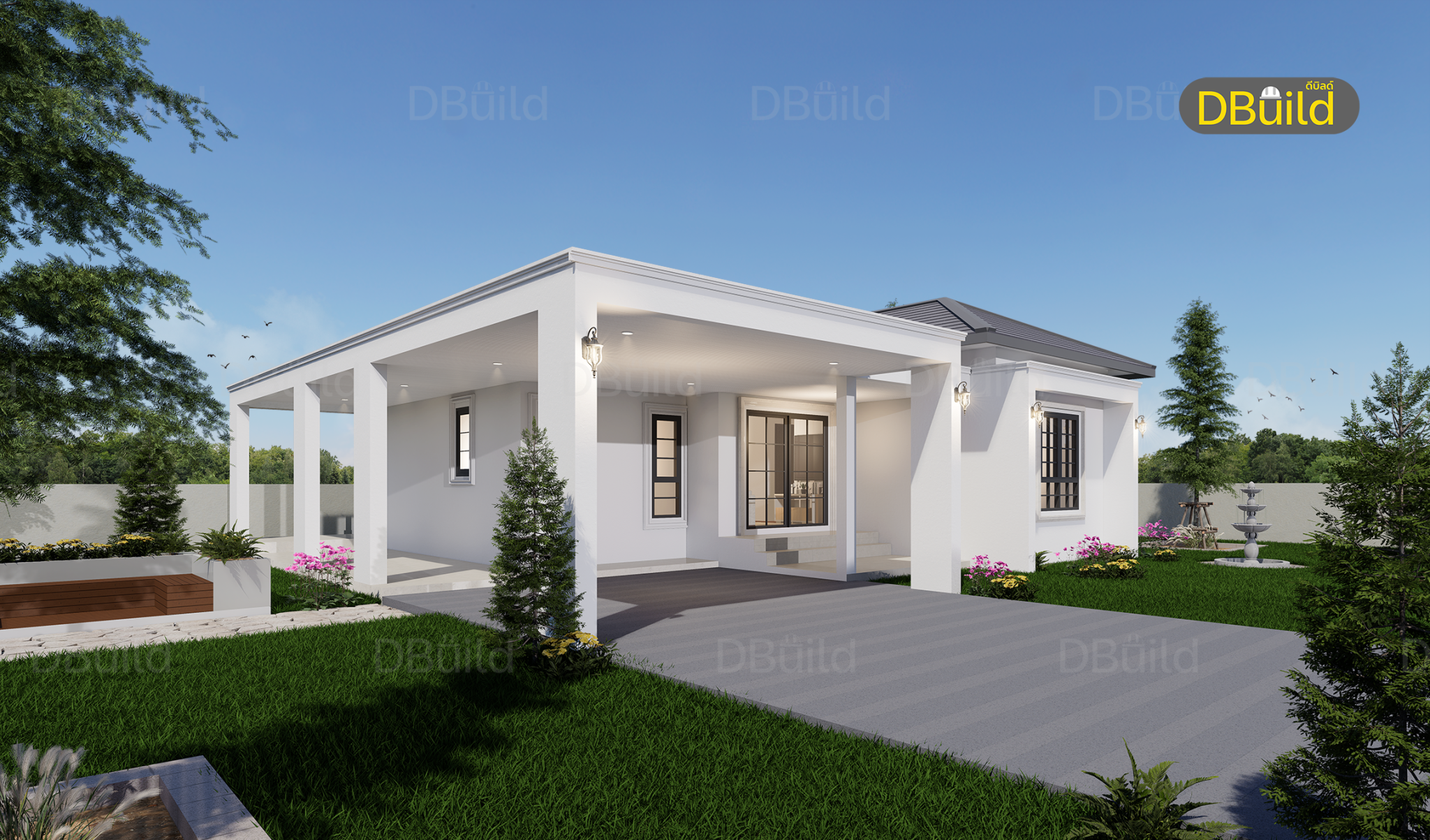 แบบบ้านชั้นเดียว 1 ชั้น 3 ห้องนอน 2 ห้องน้ำ จอดรถได้ 2 พื้นที่ใช้สอย 151 ตารางเมตร