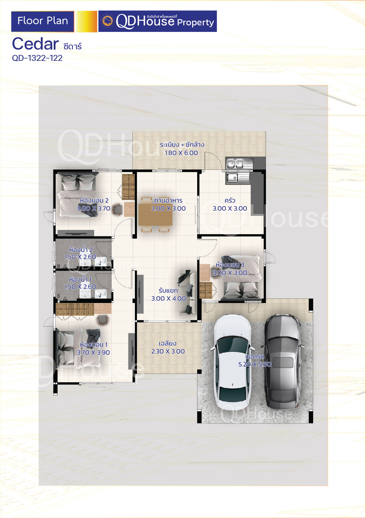 แบบบ้านชั้นเดียว 1 ชั้น 3 ห้องนอน 2 ห้องน้ำ จอดรถได้ 2 พื้นที่ใช้สอย 122 ตารางเมตร