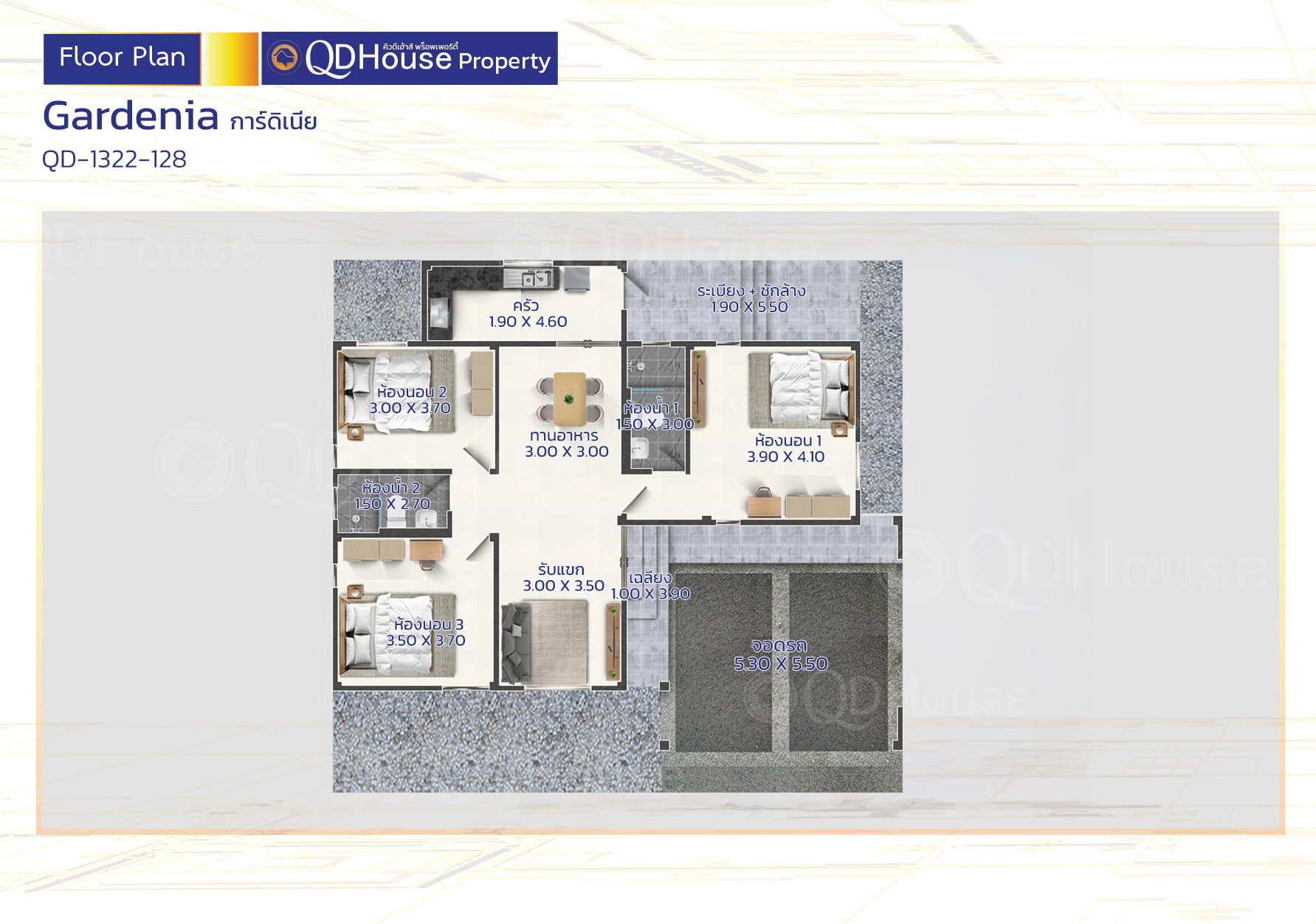 แบบบ้านชั้นเดียว 1 ชั้น 3 ห้องนอน 2 ห้องน้ำ จอดรถได้ 2 พื้นที่ใช้สอย 128 ตารางเมตร